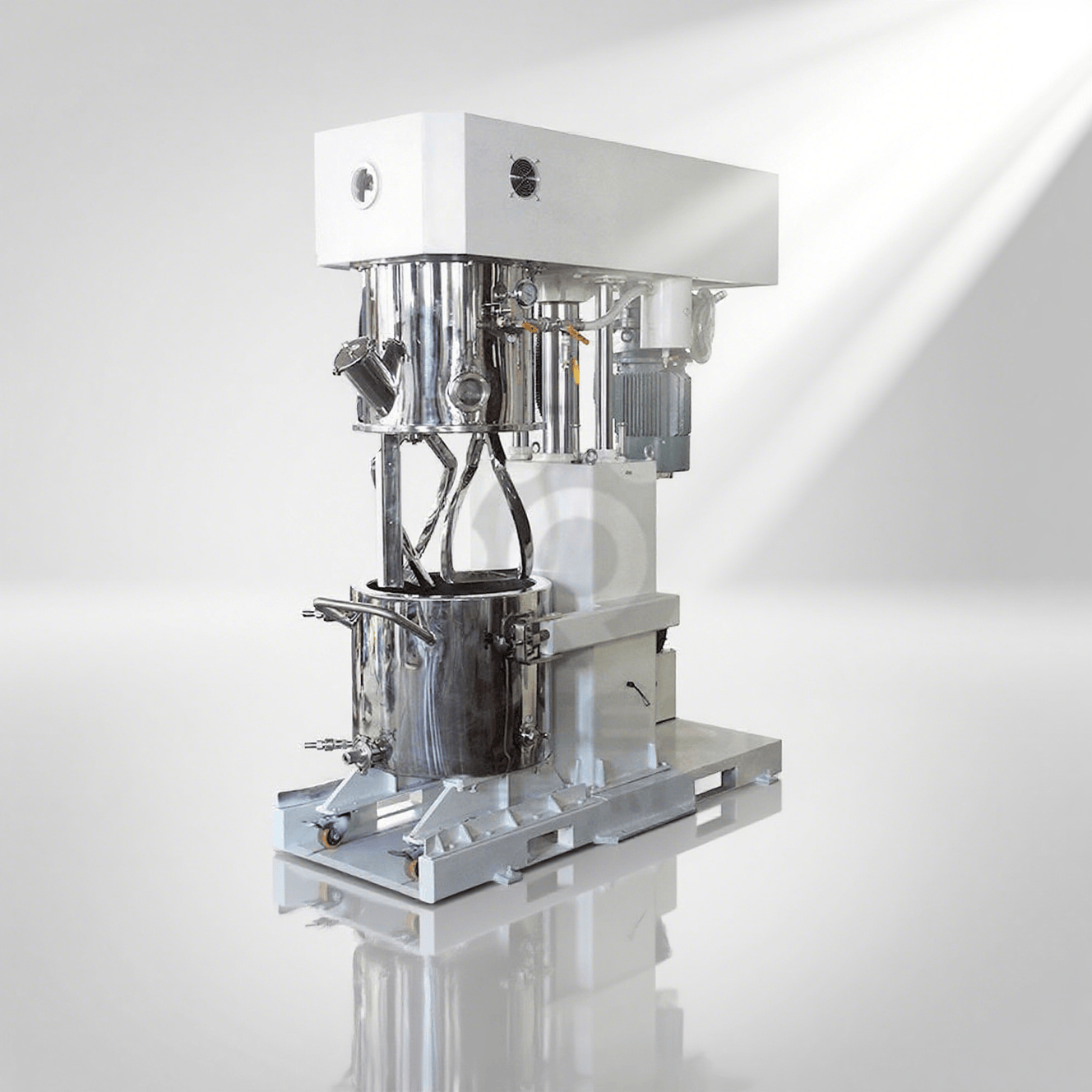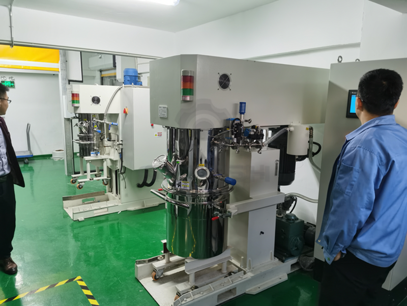 雙行星攪拌機雙行星混合機的攪拌槳葉,在公轉(zhuǎn)的同時也自轉(zhuǎn),使罐體內(nèi)物料上下及四周循環(huán)運動,從而可在很短時間內(nèi)達到混合(混煉)效果。罐體內(nèi)壁為大型立車精加工,再經(jīng)大型拋光機自動 -